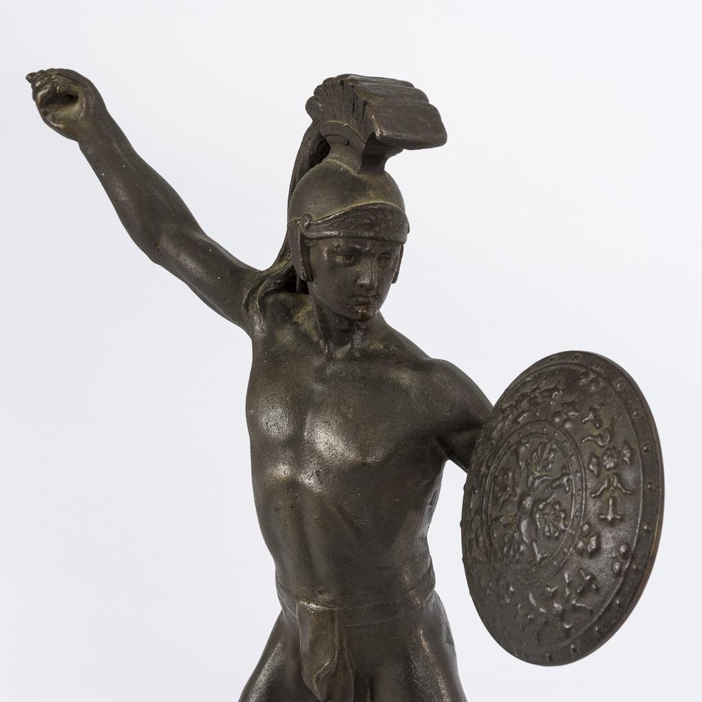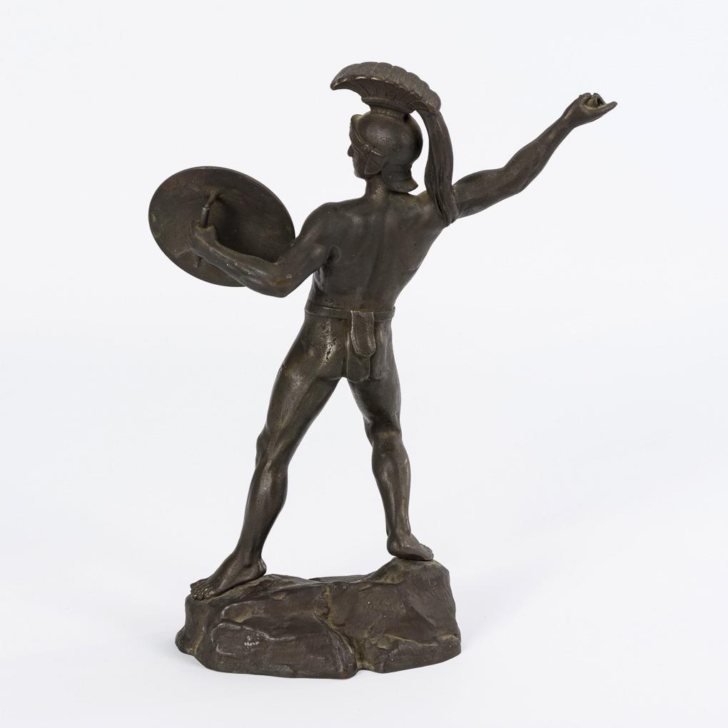 Zum Speerwurf ausholender Krieger mit Raupenhelm und reliefiertem Schild. Speer fehlt, Gusslunker.