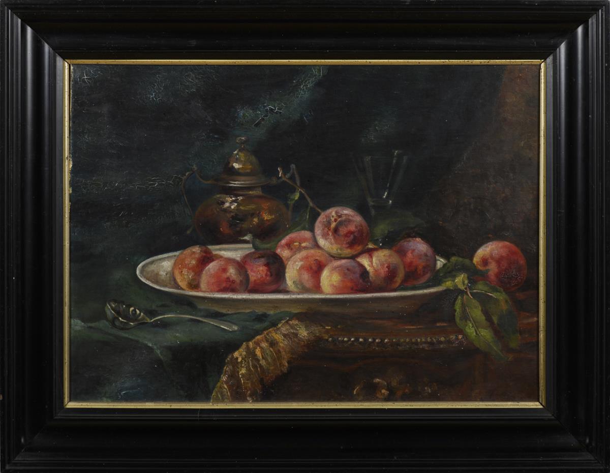 Die Früchte auf einem Teller neben Weinglas und Gefäß. Leichte Altersspuren.