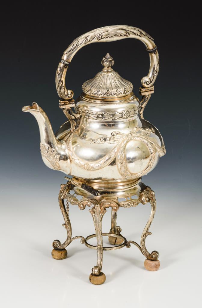 Bauchige Teekanne mit Girlandenrelief und Bügelhenkel, auf Rechaud mit 4 Holzfüßchen. Gebrauchsspuren, 1 Füßchen ergänzt.