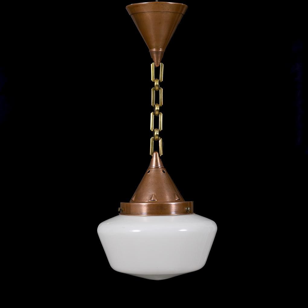 Design-Hängelampe mit kegelförmigem Korpus an Kettenaufhängung mit Kegelbaldachin; trapezförmiger Schirm aus Opalglas. Minimale Alters-/Gebrauchsspuren, Glasrand mit kleinen Chips.