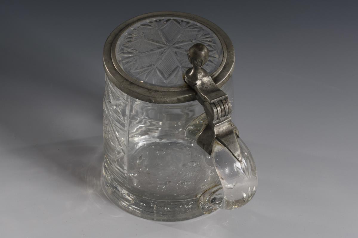 Konischer Krug mit eingestochenen Luftblasen im Boden, Bandhenkel und zinnmontiertem Deckel mit Glaseinsatz. Mit Kerb- und Steinelschliffdekor, Abriss.