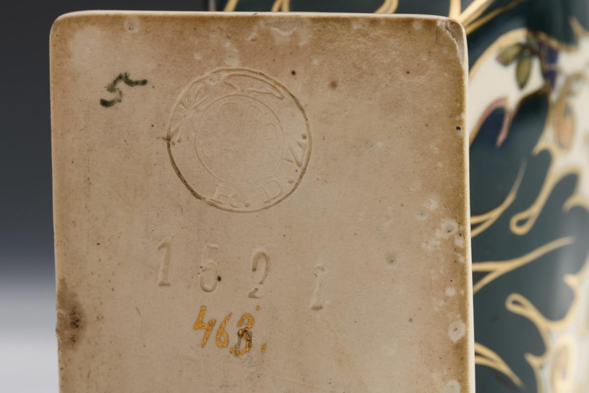 Flache Vierkantvase mit ornamental durchbrochenem Hals und stilisiert floraler Bemalung. Leicht goldberieben.
