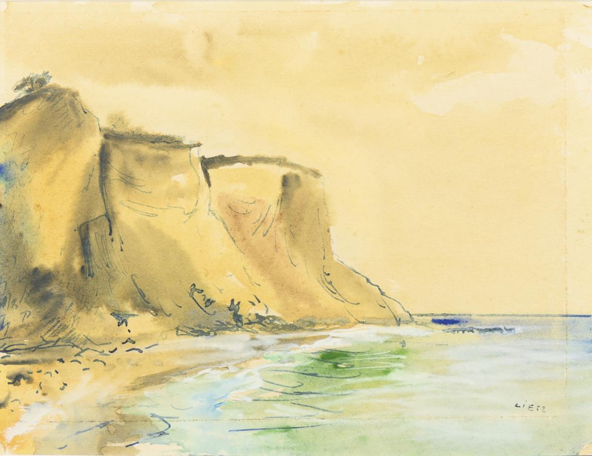 Blick entlang der Küste mit den steilen Klippen an einem sonnigen Tag. Minimale Altersspuren.
