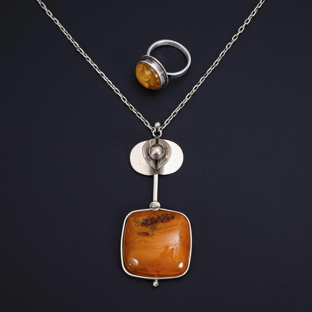 Designer-Anhänger mit Bernstein, an Kette und Ring.