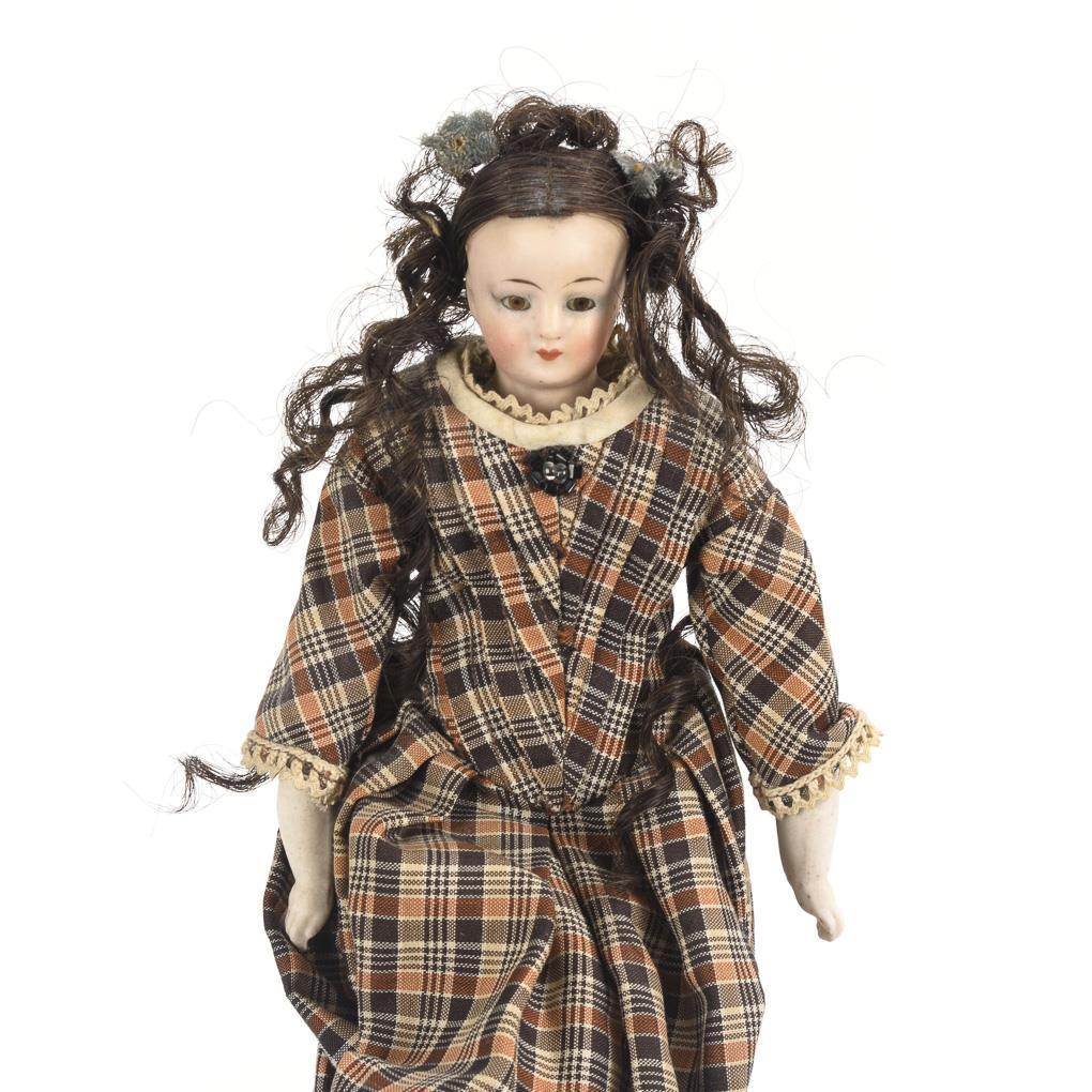 2x mit Kurbelkopf, 1x Brustkopf. 2x mit langem Kleid, 1x Trachtenkleid mit Schürze. Altersspuren und Defekte.