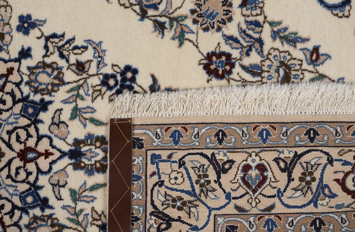 Wolle und Seide, handgeknüpft. Polychromdekor mit vorwiegend Blau und Rotbraun auf elfenbeinfarbenem Fond. Ca. 128 x 198 cm.