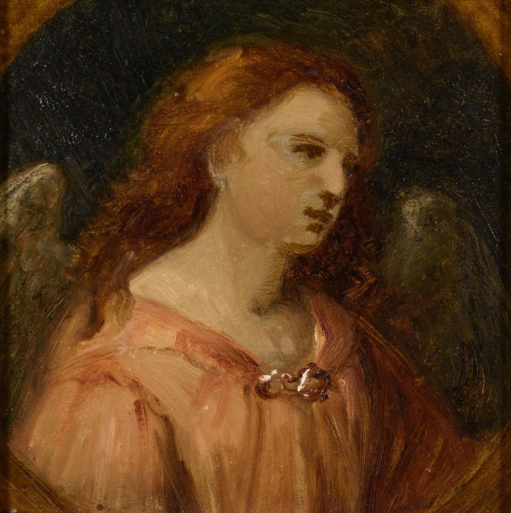 Bildnis eines Engels in gemaltem ovalen Bildausschnitt.