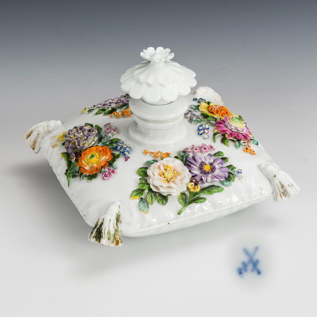 In Form eines Kissens gearbeiteter, quadratischer Flakon mit Blütenbelag. Bestoßungen am Belag, Stopfen restauriert.