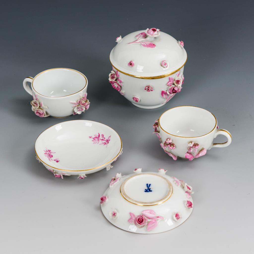 5 Teile. Mit purpurfarben staffiertem Blütenbelag. 2 Tässchen (H 3 cm), 2 Untertassen (Ý 6,5 cm) und 1 kleine Zuckerdose (H 6,5 cm). Bestoßungen am Belag.