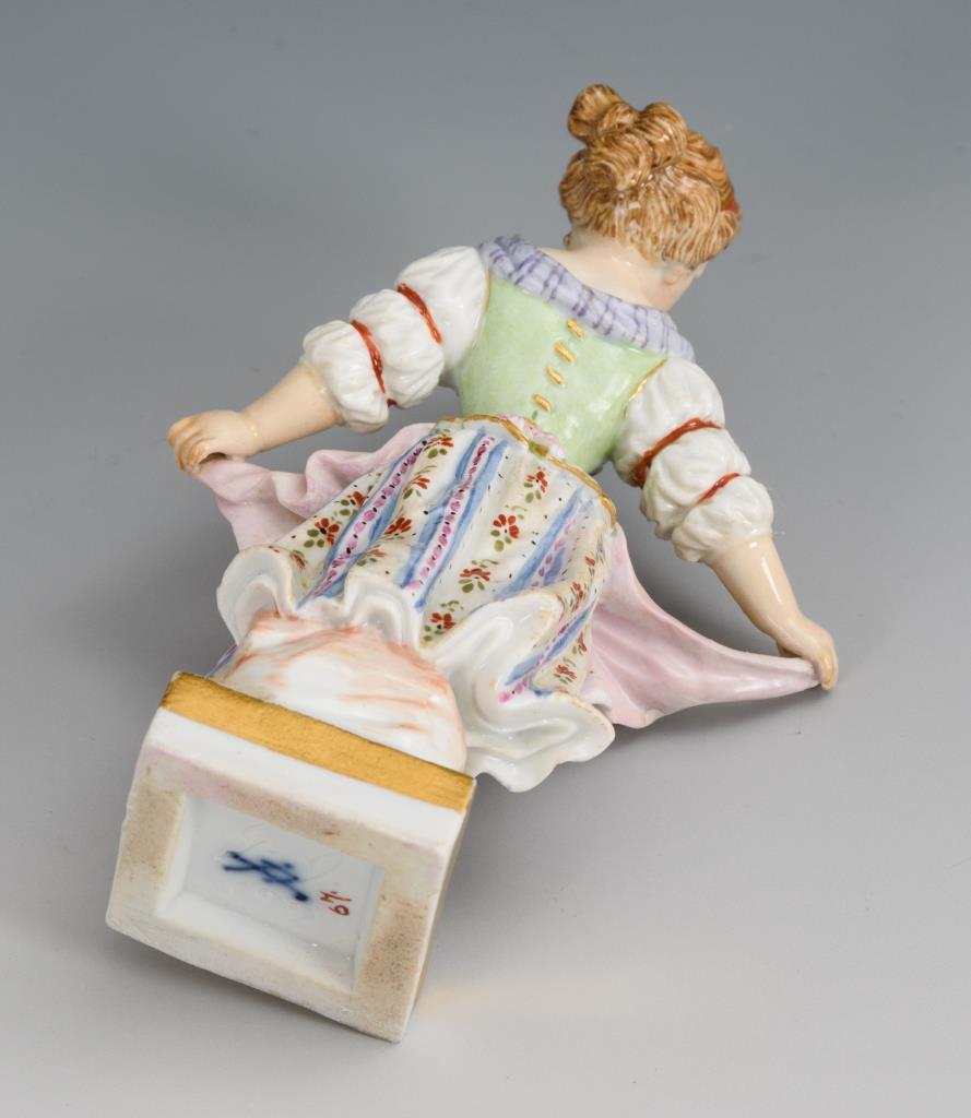 Auf einer Quadratplinthe im Tanzschritt stehendes Mädchen. Beide Hände und Teil des Haares restauriert.