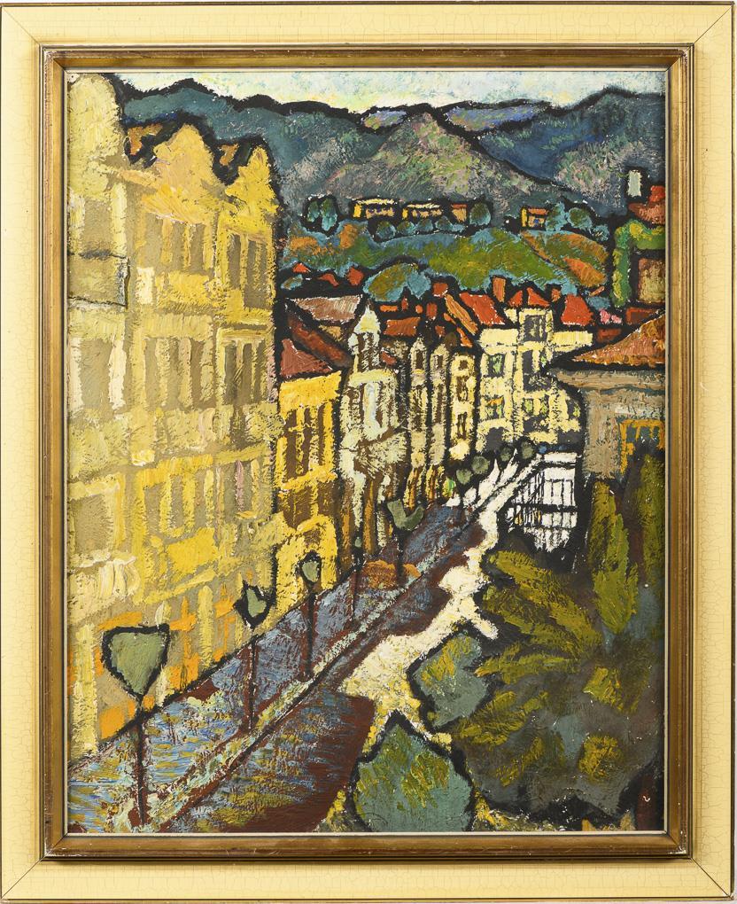 Ansicht einer Straße mit den typischen Reihenhäusern einer Stadt unterhalb der Berge. Minimale Altersspuren.