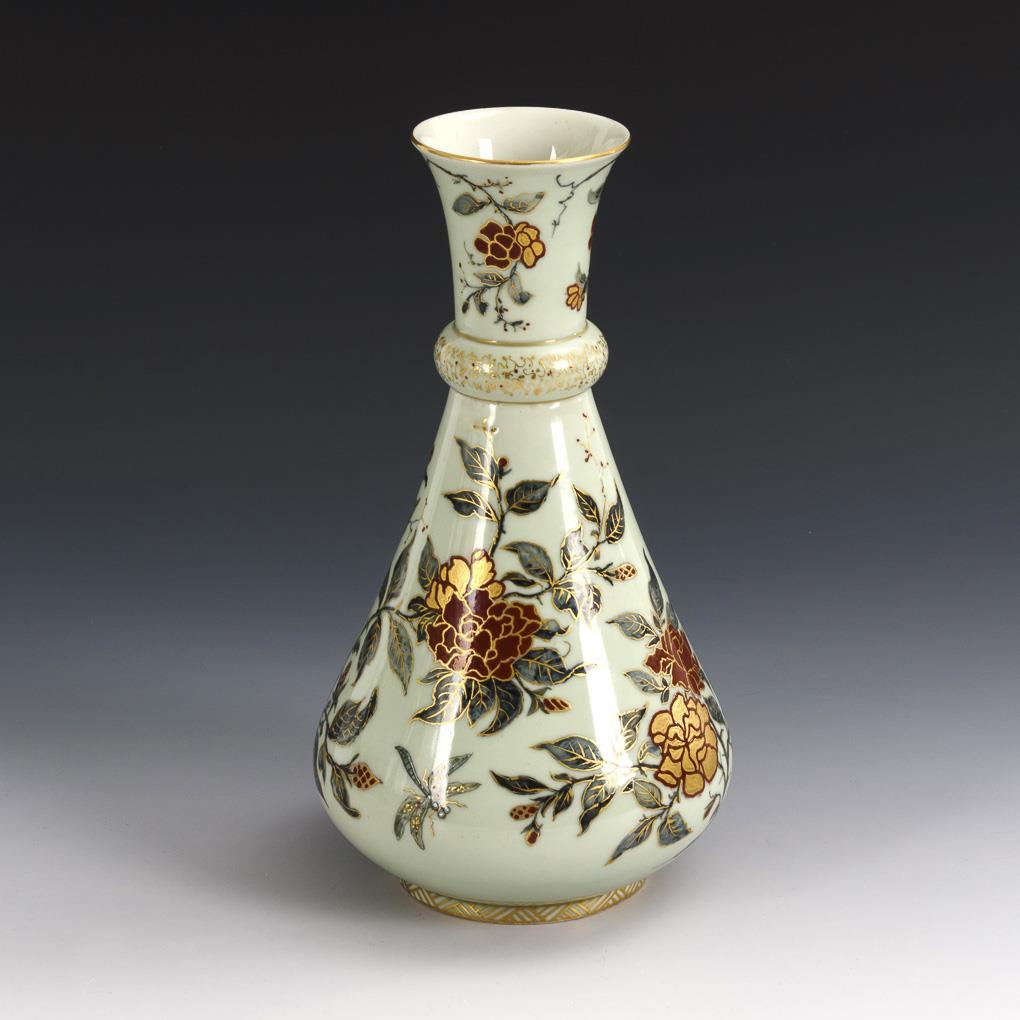 Seladonfarbener Fond, unterglasurblaue Malerei, rote Aufglasurmalerei, Goldstaffage. H 27,5 cm.