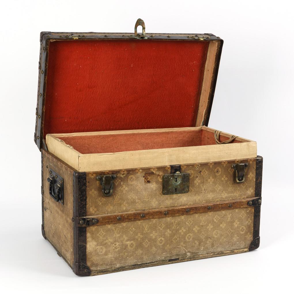 Reisetruhe bzw. truhenartiger Koffer mit Scharnierdeckel. Innen über einem Hohlfach 2 herausnehmbare Fächer mit Gurtgriffen. Teils stärkere Alters-/Gebrauchsspuren, roter Innenstoff eventuell ergänzt.
