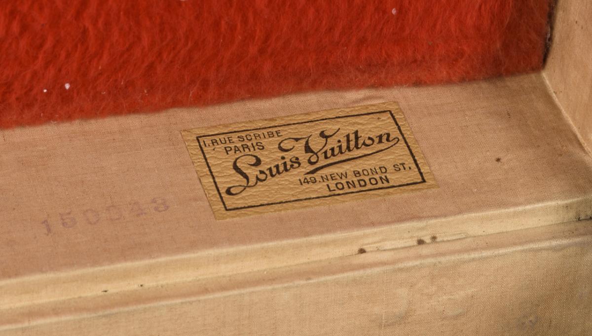 Im Deckel Firmen-Etikett mit Adressen in Paris und London sowie gestempelte Nr. "150043", Schlossblende gemarkt mit Nr. "022821", Schließen sowie Griffplatten und Ziernägel je gemarkt, Außenstoff allseits mit eingewebtem Firmenlogo. 1. Drittel 20. Jh.