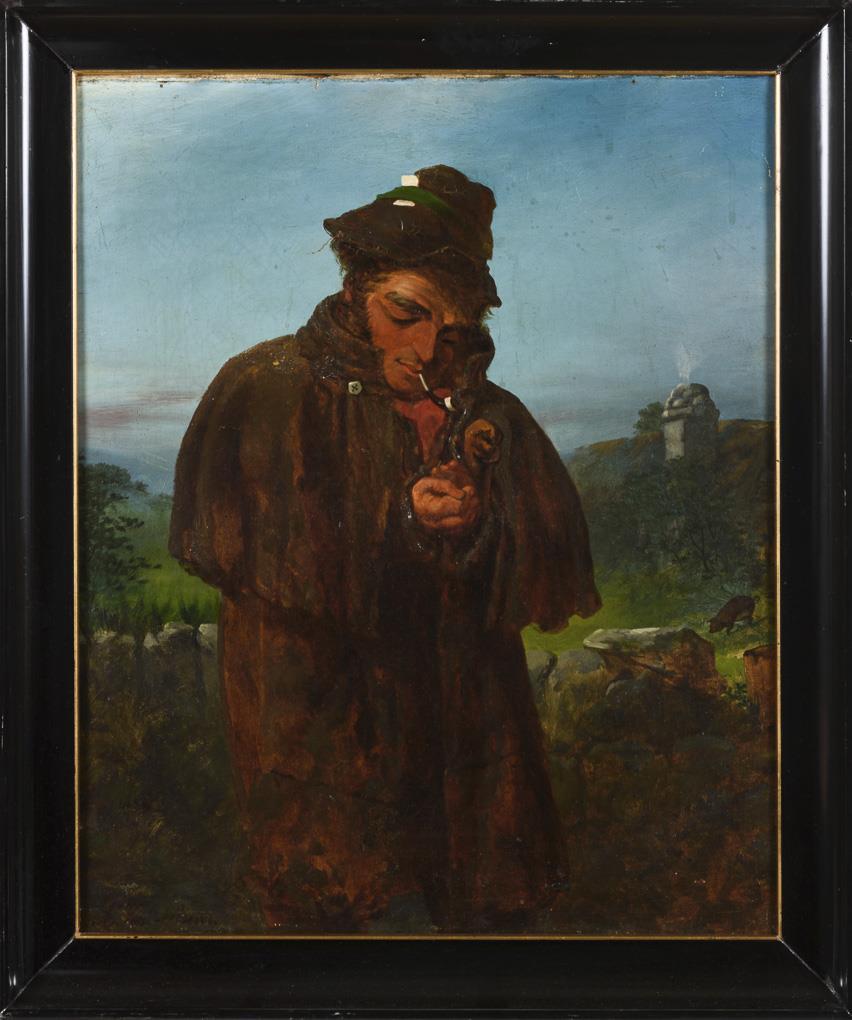 Porträt eines jungen Mannes vor dem Haus beim Anzünden der Pfeife unter blauem Himmel. Restauriert mit Hinterklebungen.