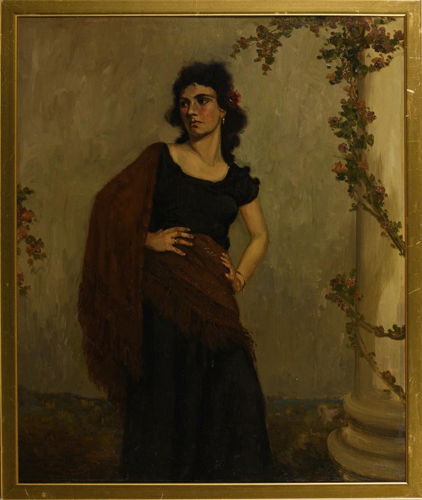 Bildnis einer stehenden jungen Frau im schwarzen Kleid mit Rosenblüte im schwarzen, lockigen Haar. Leichte Altersspuren.
