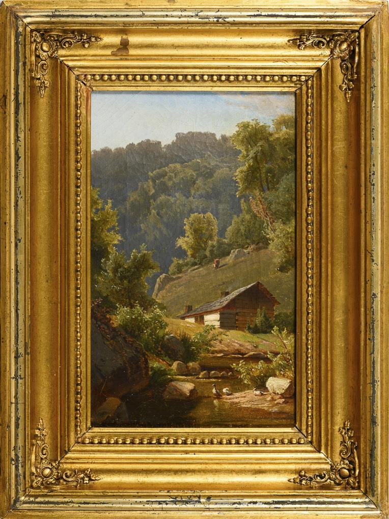 Blockhaus hinter dem Fluss mit Enten sowie Blick zur steilen Weide mit Kuh; im Hintergrund bewaldete Berghänge. 1 kleine restaurierte Stelle, minimale Retuschen am Rand, krakeliert.