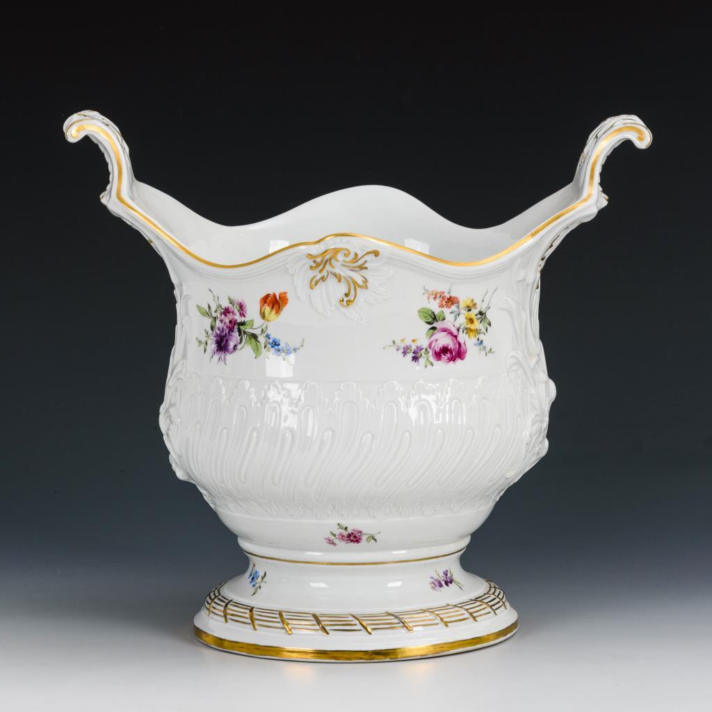 Gefußte, hohe Schale mit zwei Handhaben sowie Rocaille- und Schilfblattrelief.