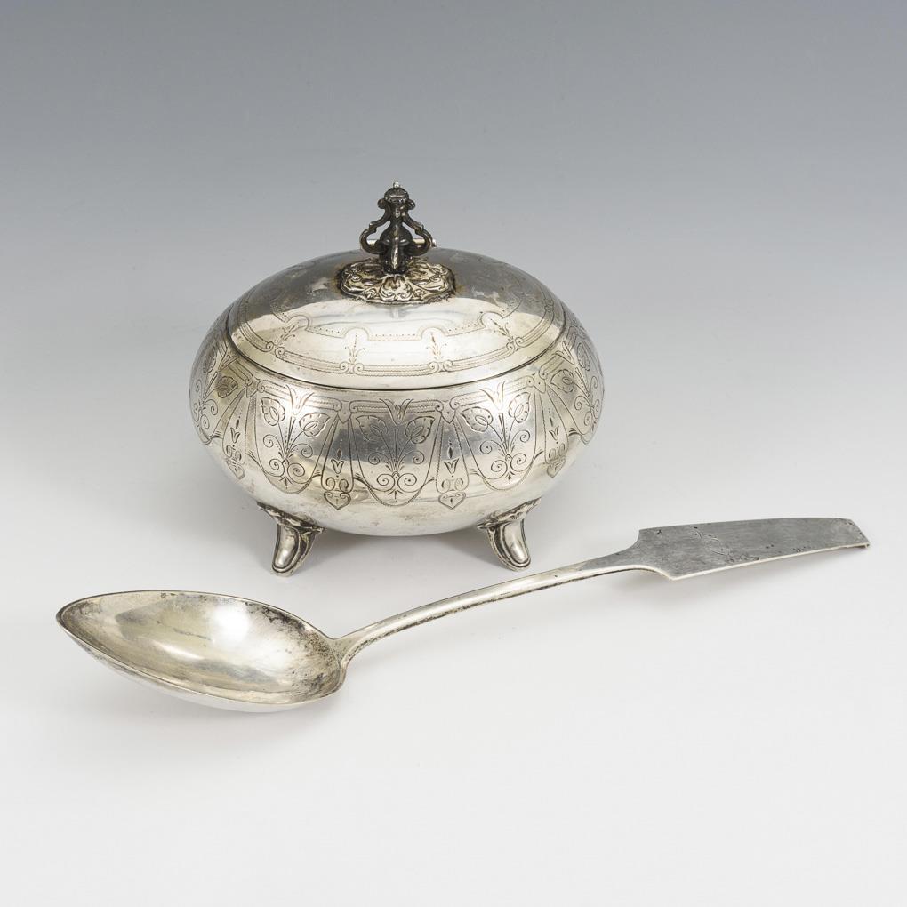 Ovale Dose mit floralen Gravuren, innen vergoldet. 14 x 15 x 12 cm. / Großer Biedermeier-Löffel mit Monogrammgravur "C.T." L 29,5 cm. Leichte Altersspuren. Dose mit kleinen Dellen, Knauf etwas gelockert.