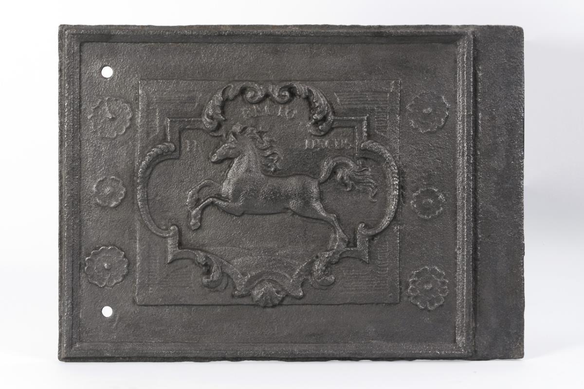Rechte Seitenplatte von einem Kastenofen/Fünfplattenofen. Im profilierten Rechteck-Bildrahmen zwischen Rosetten eingestellte Kartusche mit springendem Pferd sowie Devise "In Recto Degus". Links neben der Kartusche 2 Bohrlöcher für die Ofenmontage. Rostspuren.