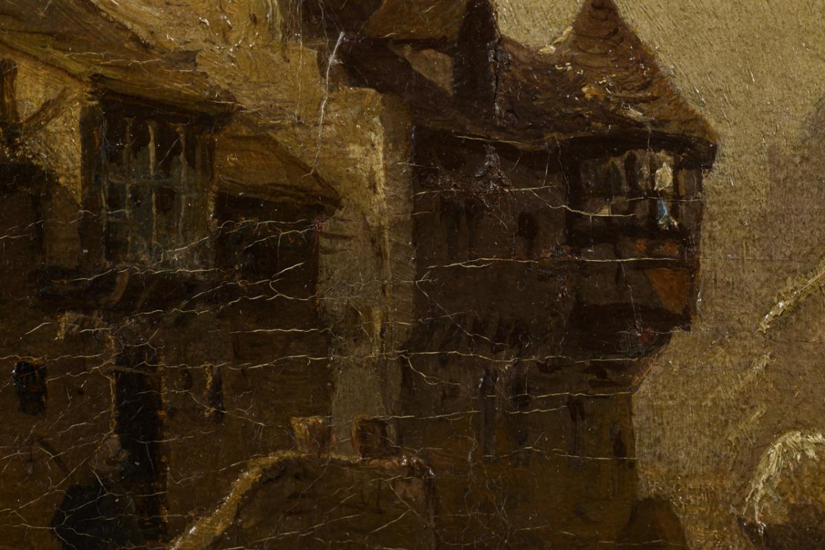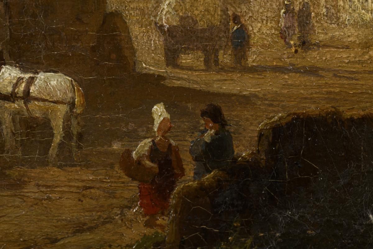 Staffagefiguren auf der Straße am Stadtrand im Sonnenlicht nahe den ersten Häusern am Wasser. Minimale Altersspuren.