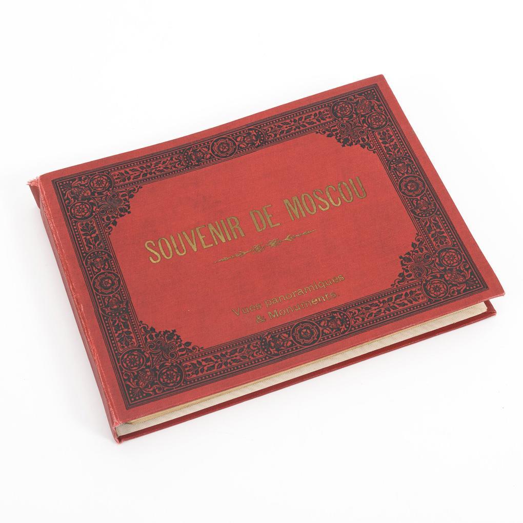 24 gedruckte, fotografische Ansichten als Leporello, französisch bezeichnet. Im geprägten, roten Leineneinband.