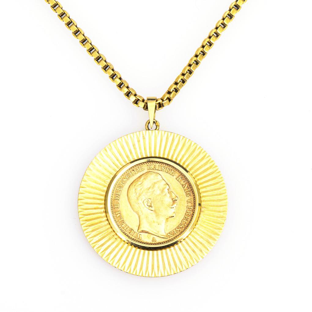 Gelbgold-Kette 750 gestempelt/Anhängerrahmen Gelbgold 750 geprüft/Münzgold 900. Anhänger Ø 3,7 cm. Kette L 82 cm. Anhänger 15,3 g. Kette 17,1 g. Münze 7,96 g.