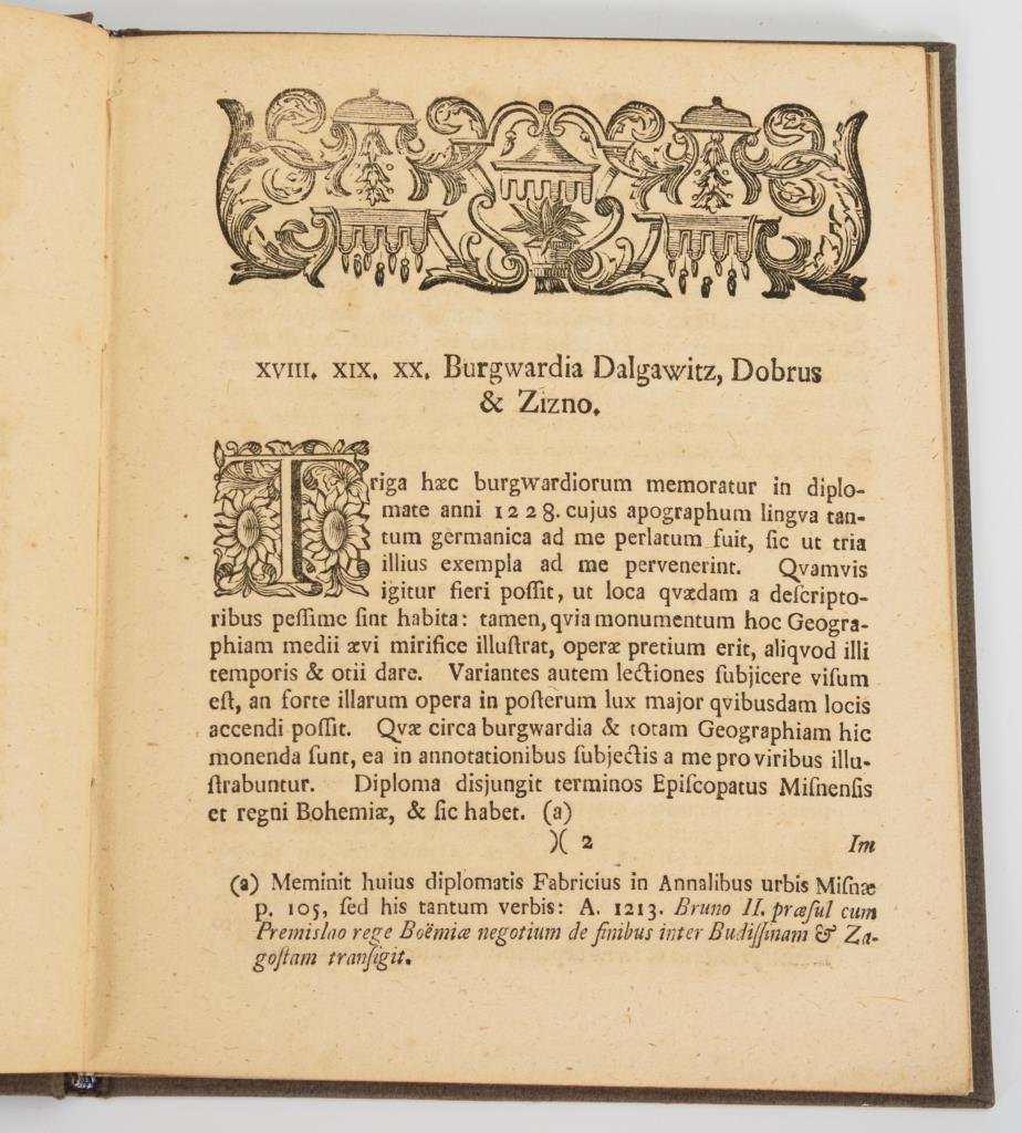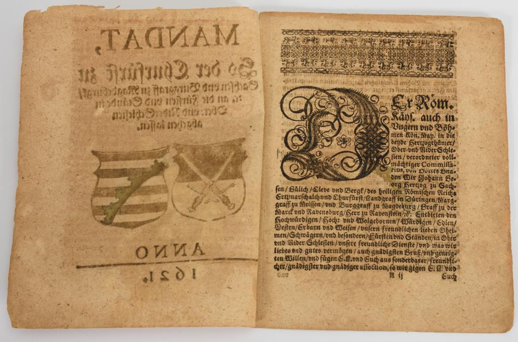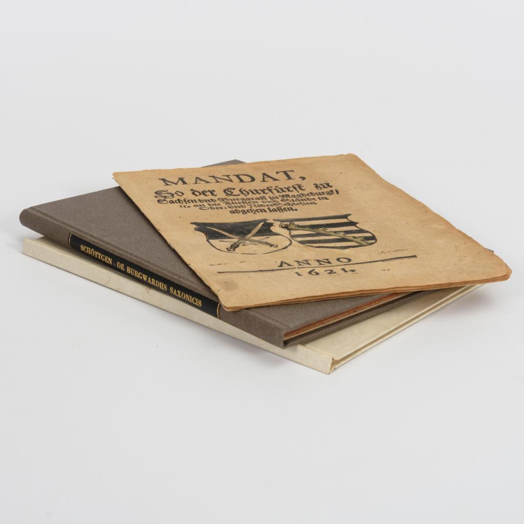 "Mandat, So der Churfürst zu Sachsen und Burggraf zu Magdeburg, an die Fürsten und Stände in Ober: und NiderSchlesien abgehen lassen." Anno 1621, 8 Seiten, ungebunden. / "Copia Dritten beweglichen Intercession-Schreibens, An Die Röm. Kay. Mayst. Ferdinand II. & c. von ... Herzog Johan Georgen, Churfürst zu Sachsen, de dato Dresden den 16. Martii Anno 1630. Wegen der Evangelischen betrangten Burgerschafft in der des D. ReichsStadt Augspurg in puncto Religionis, abgangen". 18 Seiten, jünger gebunden. / "Analecta de Burgwardiis Saxonicis altera, simul vero musarum Fautores ac patronos adaudiendas Orationes VII. (1748, 1750, 1747) Decenter invitat Christianus Schoettgenius, Rector, Dresdae, Literis Harpeterianis" und "Auspicia sanctissimi muneris ... M. Friderico Leberecht Kochio, Ecclesiae Torgaviensis Pastori Primario ... " (1801). 14, 12, 16, 15 Seiten zusammen im jüngeren Einband.