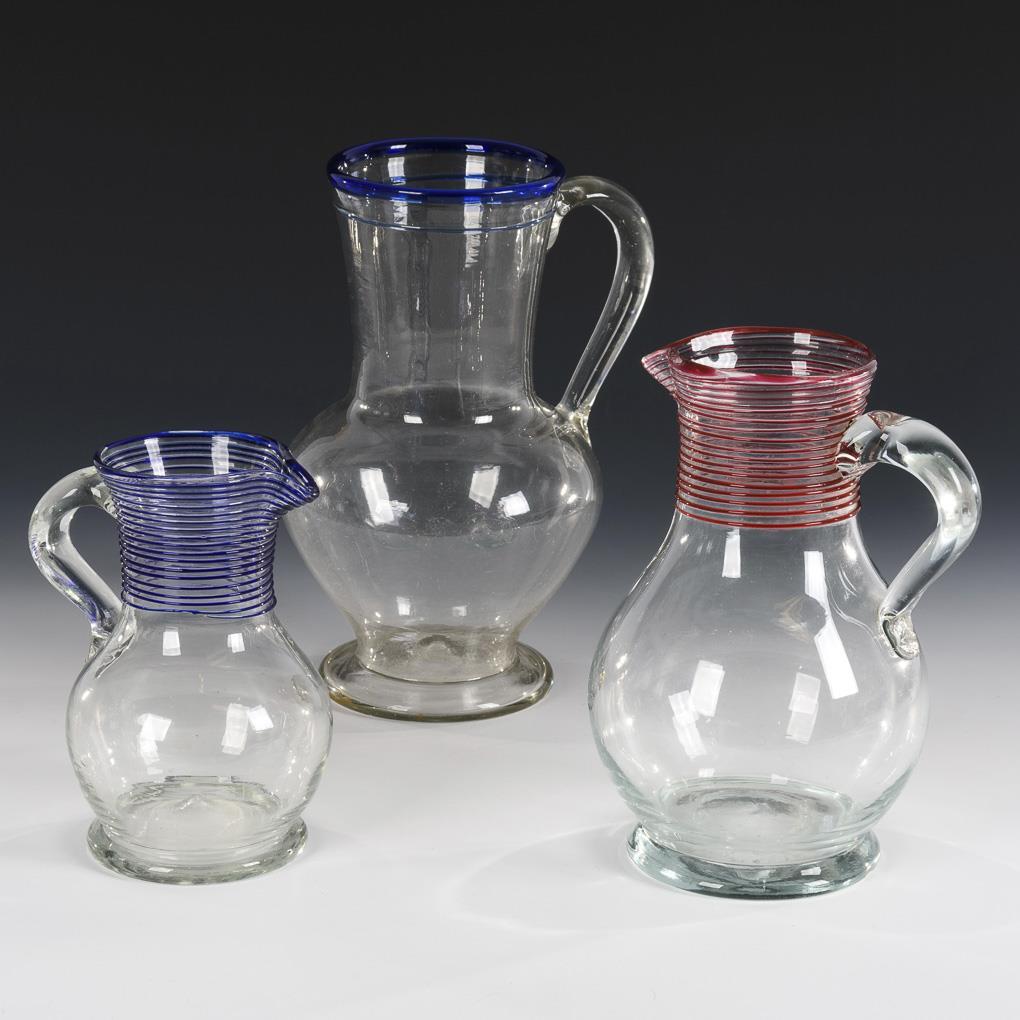 Farbloses Glas, roter bzw. blauer spiralig aufgeschmolzener Faden am Hals, 1x kobaltblauer, aufgeschmolzener Faden am Rand; alle mit Abriss. H 18, 23 und 26,5 cm.
