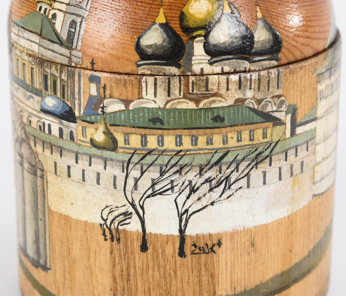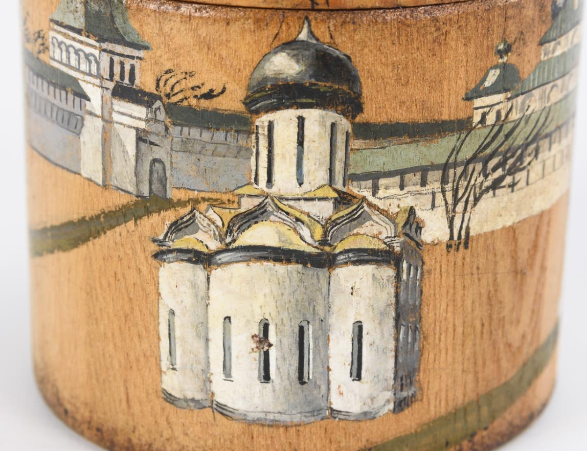 Naturbelassene Dose mit umlaufender Moskau-Ansicht (Kreml). Schwarze Dose mit Deckel-Malerei: Bäuerin vor dem Haus. Einige Alters-/Gebrauchsspuren, kleine Abplatzer am ebonisierten Deckel.