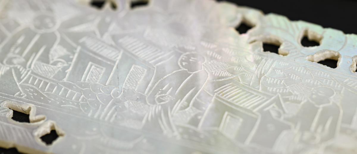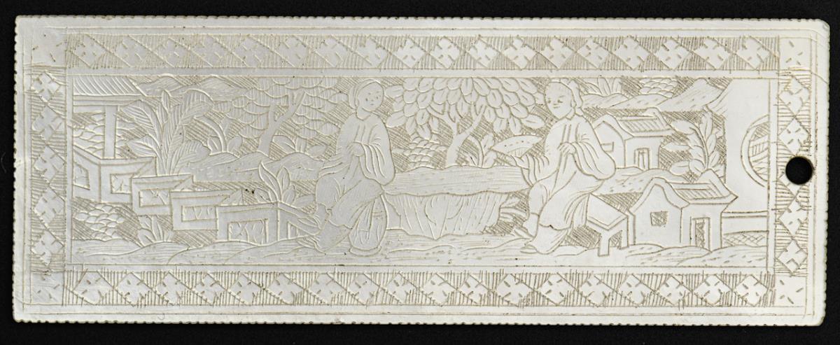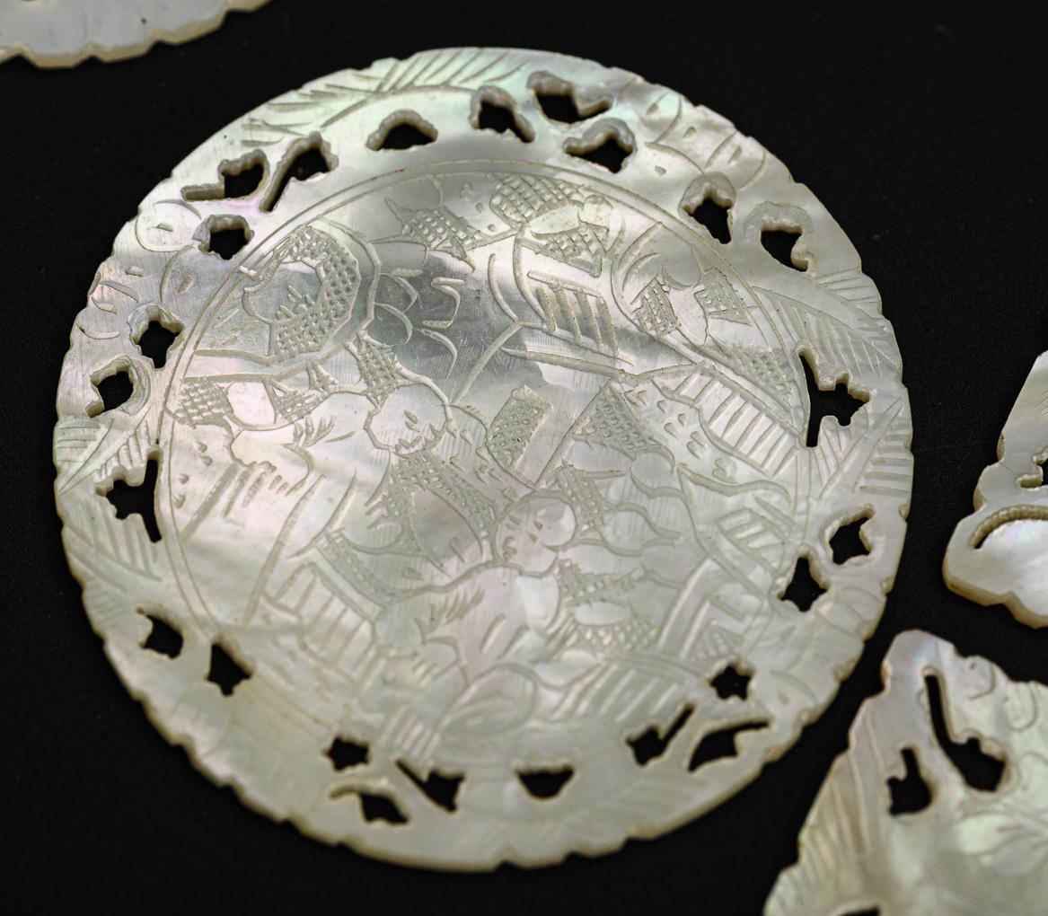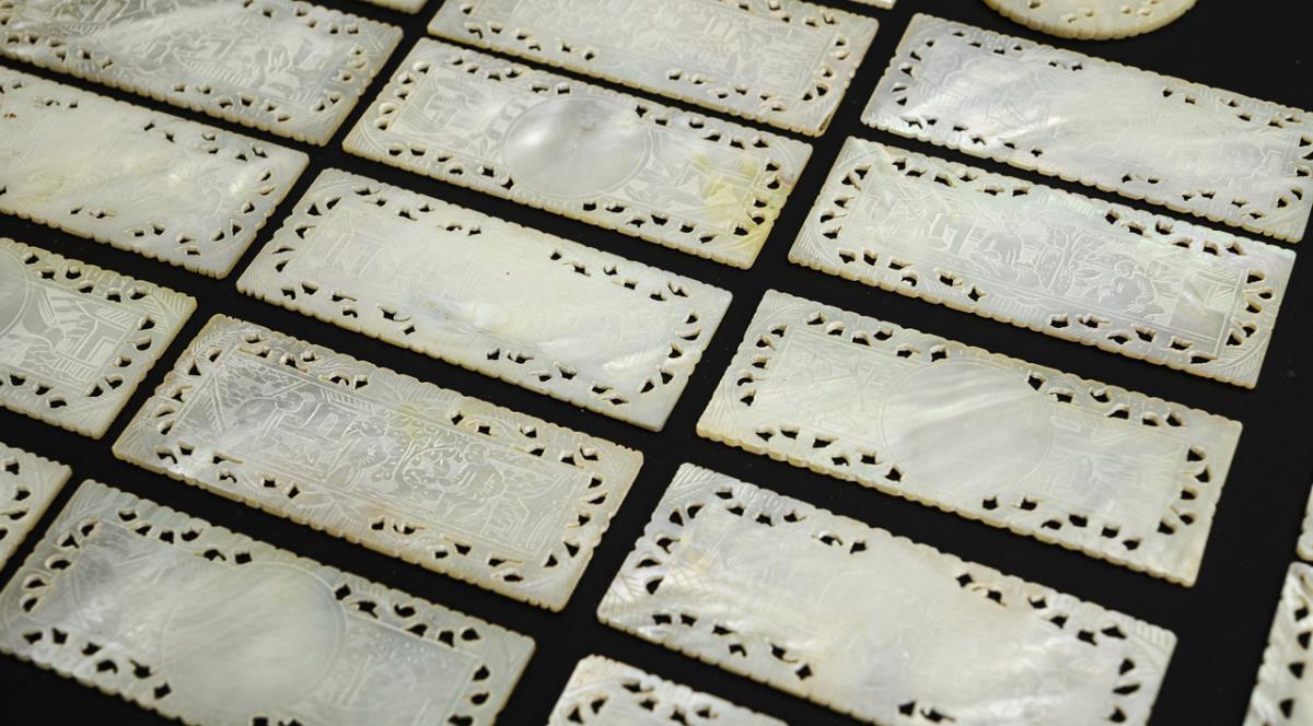 32 längsrechteckige, 9 rechteckige und 9 runde Jetons; je mit Chinoiserie-Gravuren auf beiden Seiten sowie durchbrochenem Rand. 1 längsrechteckiger Jeton ergänzt.