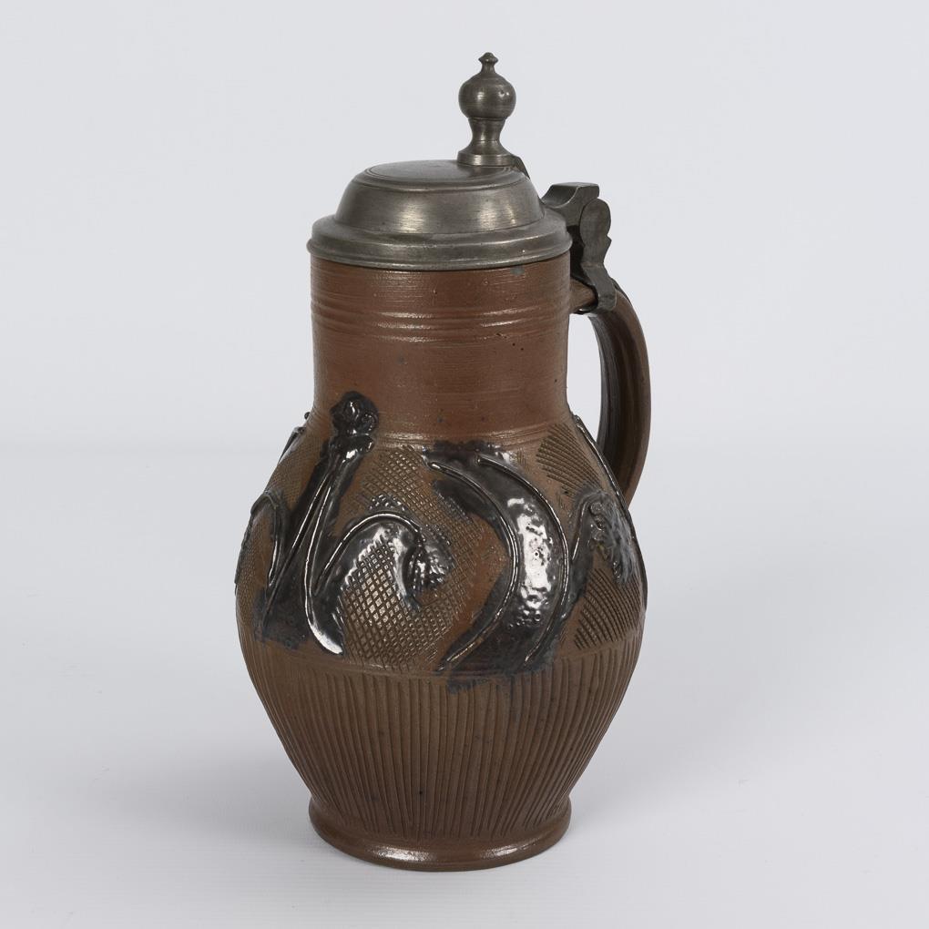 Brauner, salzglasierter Steinzeug-Krug mit fein gerilltem Zylinderhals, gebauchter Wandung und Bandhenkel. Vertikaler Kerbschnitt, kreuzgekämmte Felder und aufgelegte, schwarz engobierte Blütenstengel. Flacher Zinndeckel mit Eicheldrücker. Deckel gelockert, minimale Randbestoßung.
