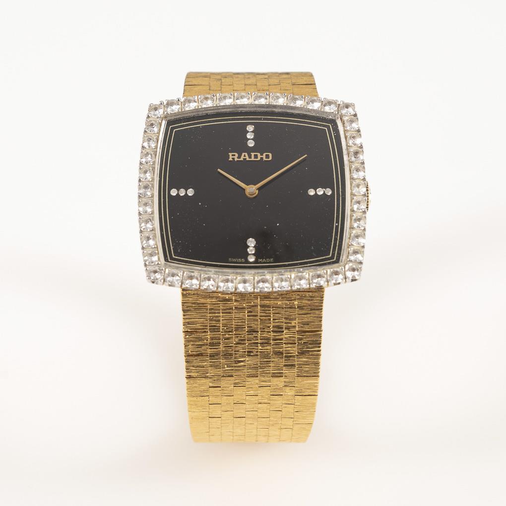 Federwerk mit Kronenaufzug, läuft. Schwarzes Zifferblatt mit steinbesetzten Viertelstundenmarkierungen und Dauphine-Zeigern.