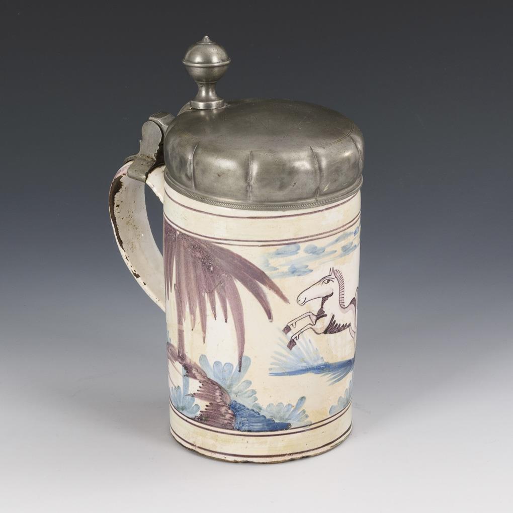 Zylinderkrug mit Bandhenkel. Schauseitig ein springendes Pferd zwischen Bäumen. Profilierter Zinndeckel mit Kugeldrücker, undeutlich graviert, innen gepunzt. Restauriert, Glasurbereibungen und -bestoßungen, Zinndeckel mit Alters- und Gebrauchsspuren.