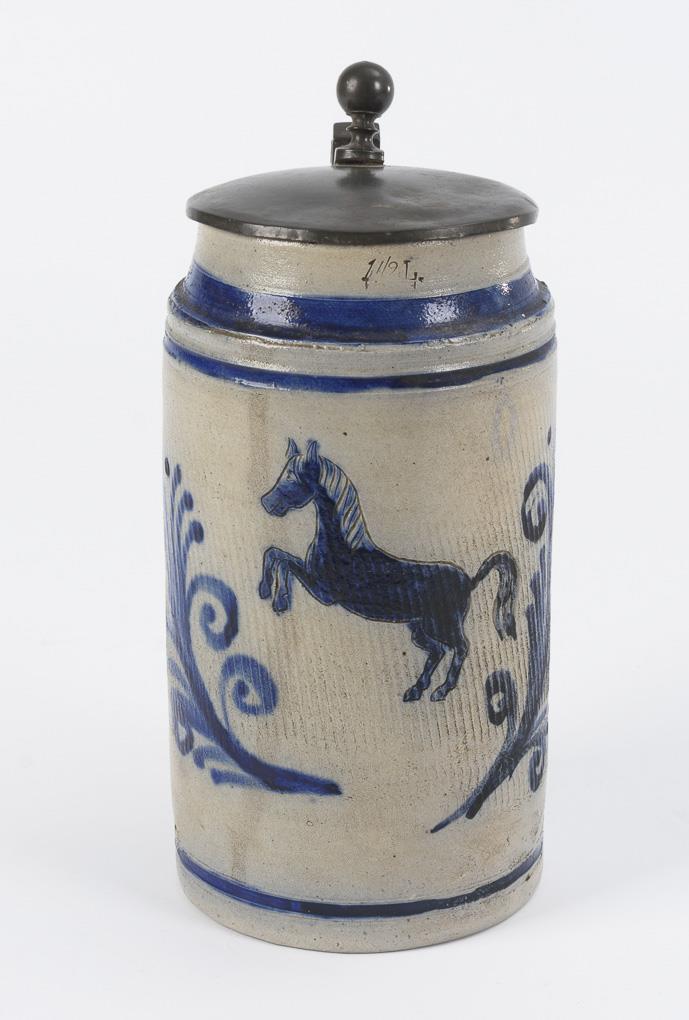Westerwälder Walzenkrug mit steigendem Pferd.