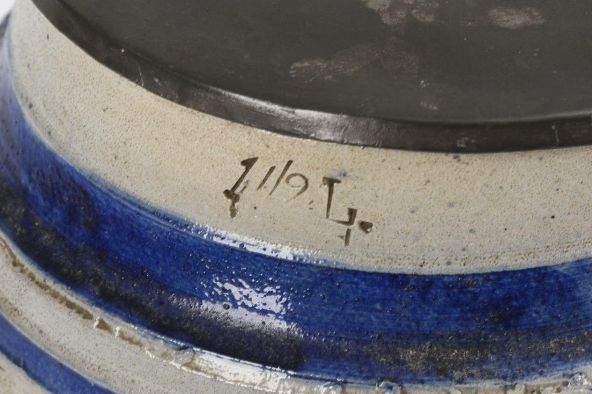 Graues, salzglasiertes Steinzeug mit Bemalung in Kobaltblau. H 24,5 cm.