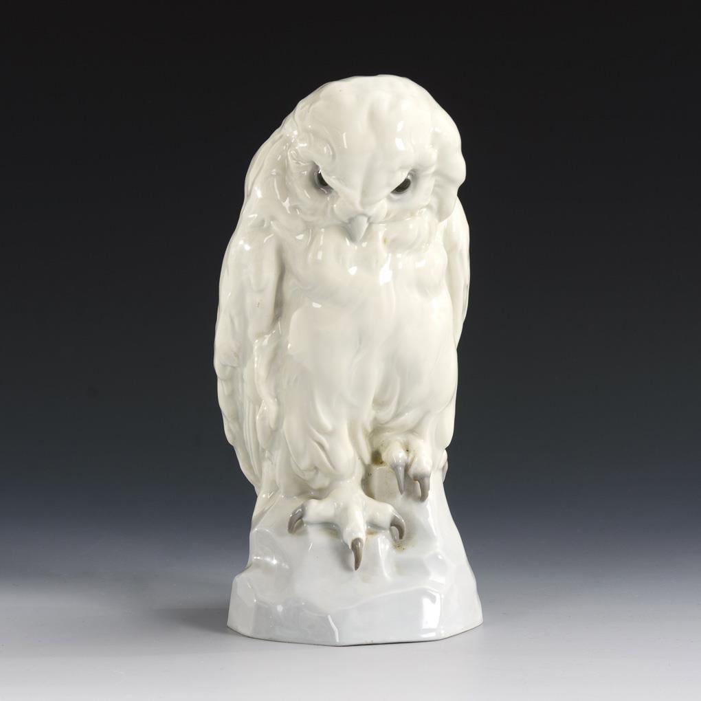 Auf einem Steinsockel sitzende Eule. Unterseitig kleine Bestoßung am Stand.
