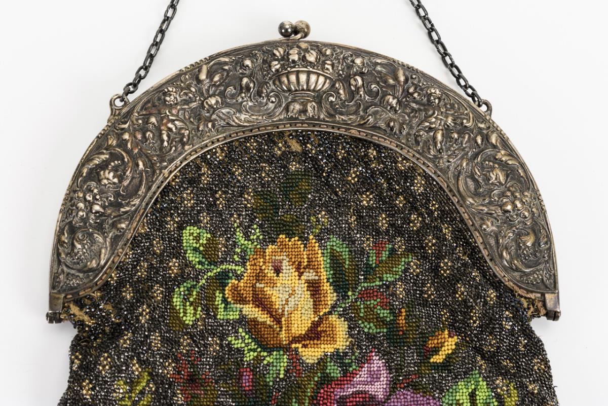 Massiver Silberbügel beidseitig mit Blumenkorb und Ranken sowie Putten reliefiert sowie Tragekette. Perlenstickerei beidseitig vollflächig mit gleichem Rosenmotiv sowie Pampel-Abhängung; innen floral gewebter Stoff. Einige wenige Fehlstellen und Alters-/Gebrauchsspuren.
