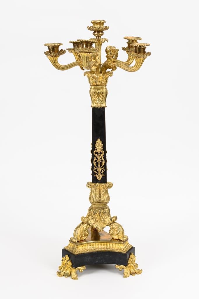 Reich antikisierend vegetabil reliefierter Kerzenleuchter: 3-seitiger Sockel mit Bronze-Blattfüßen, 3-beiniger Fuß, Dreikant-Marmorschaft mit Appliken, 5 vegetabile Arme mit Tüllen sowie erhöhte Zentraltülle. 3 Arme mit Haarrissen, 1 Wachsteller fehlt, einige Alters-/Gebrauchsspuren.
