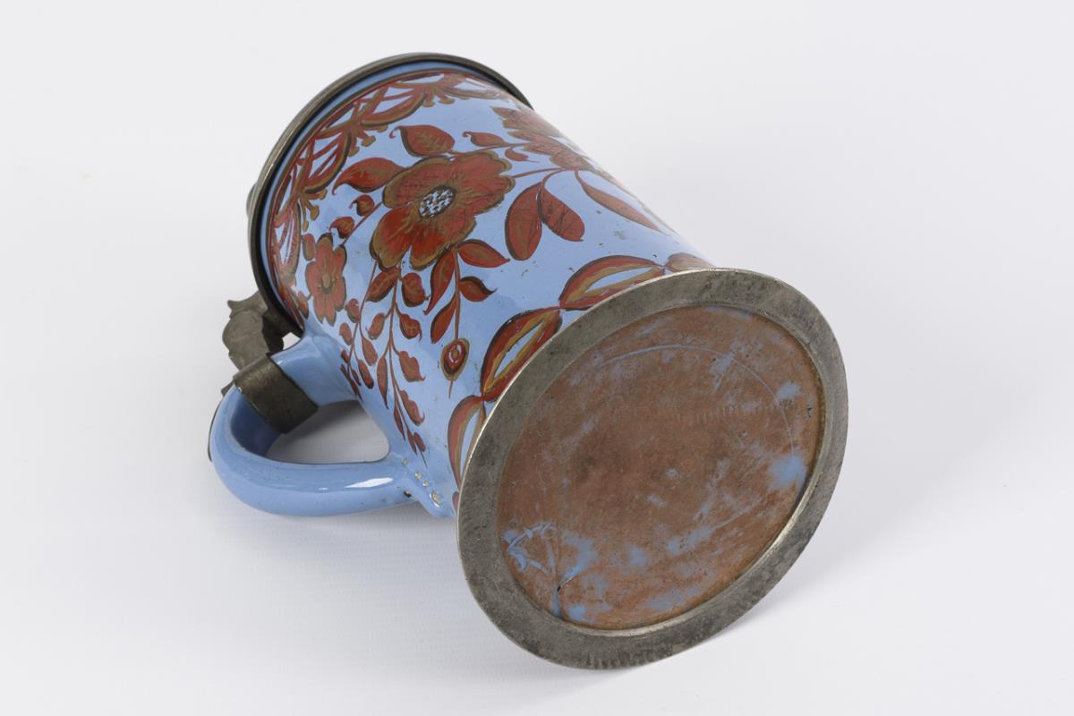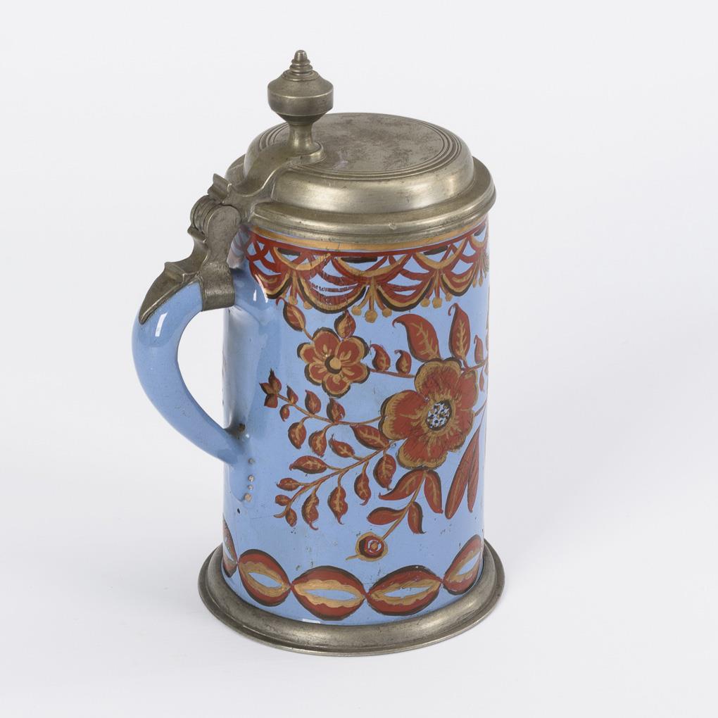 Zylinderform mit Bandhenkel. Auf der Wandung Blumenzweige mit großen Blüten, Feston-Malerei. Profilierter Zinndeckel mit Kugeldrücker, Zinnstandring. Glasur- und Dekorbereibungen, feiner Wandungsriss am Henkelansatz.