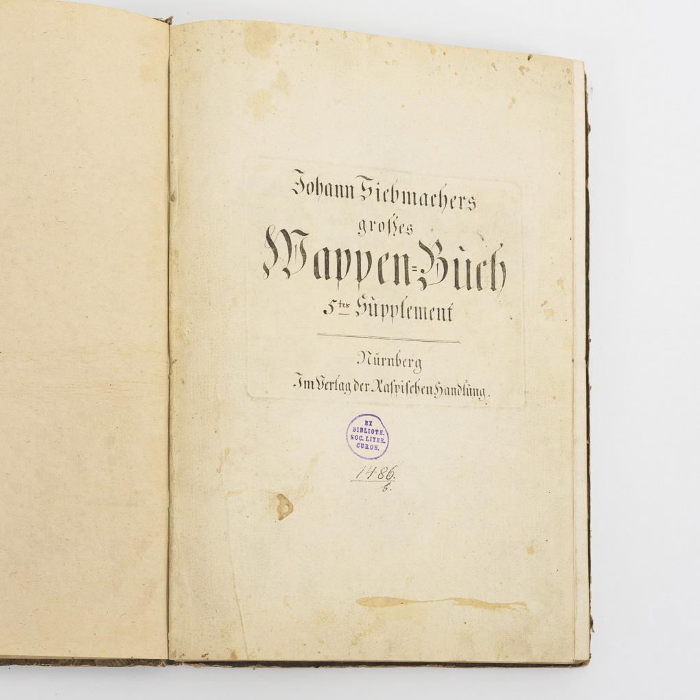 5., 6. und 7. Supplementteil in einem Buch, jeweils mit Register. 30, 30, 30 Tafeln mit meist je 12 Wappendarstellungen. Pappeinband. Rücken defekt aber Block fest.