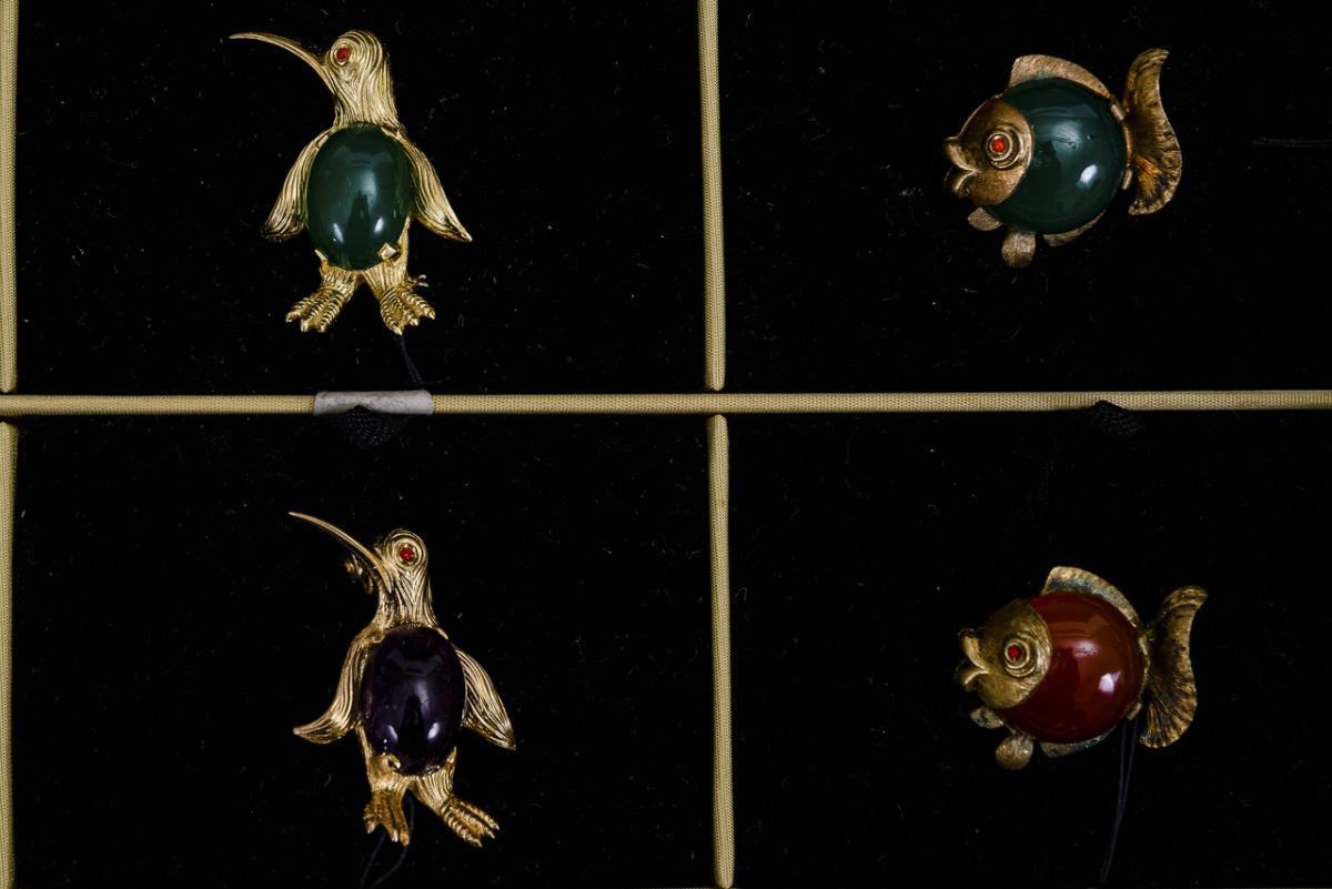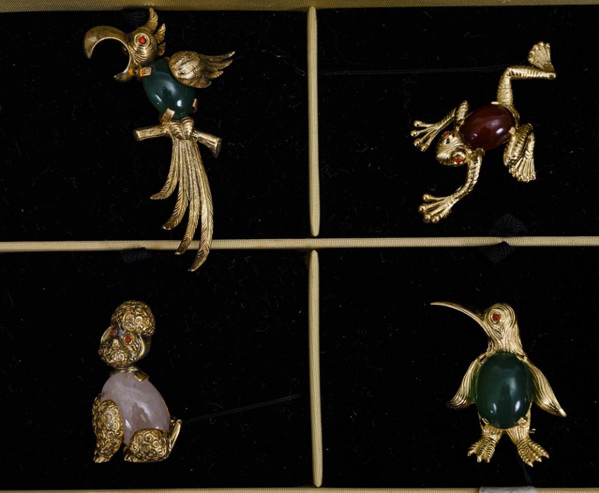 11 halbplastische Tierbroschen mit Kugelbauch-Cabochons und 5 Tierbroschen partiell mit Emaille und Straßbesatz. Kugelhaken.