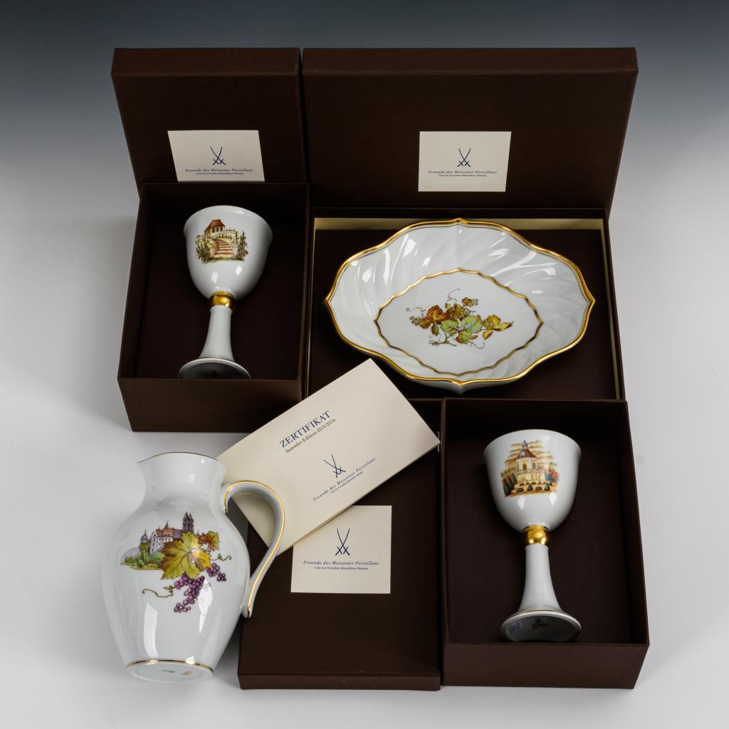 2 Pokale (H 16,5 cm): 1x mit der Ansicht von Schloss Wackerbarth und 1x mit der Ansicht des Winzerhauses Luisenburg, Vierpassschale mit Weinrebe (L 24,5 cm) und Krug mit Ansicht der Albrechtsburg in Meissen (H 17,5 cm) .