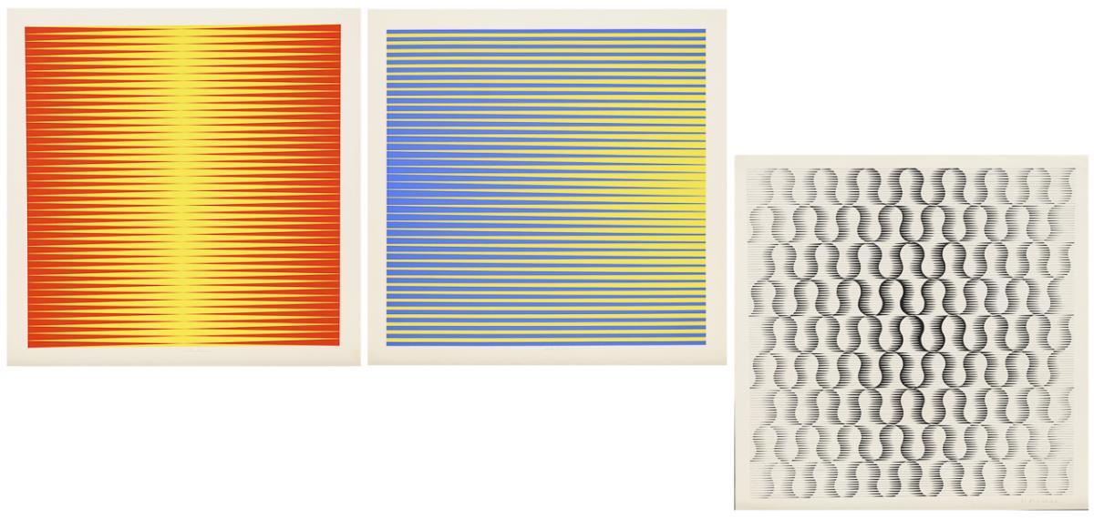 2 Op-Art-Werke Getulio Alviani: Gelb-Blau-gestreift, Blatt: 49,5 x 50 cm | Gelb-Rot-gestreift, Blatt: 51 x 50 cm | 1 Op-Art-Werk H. Andree ?, Blatt: 59,5 x 59,5 cm, oberer Rand knickspurig.