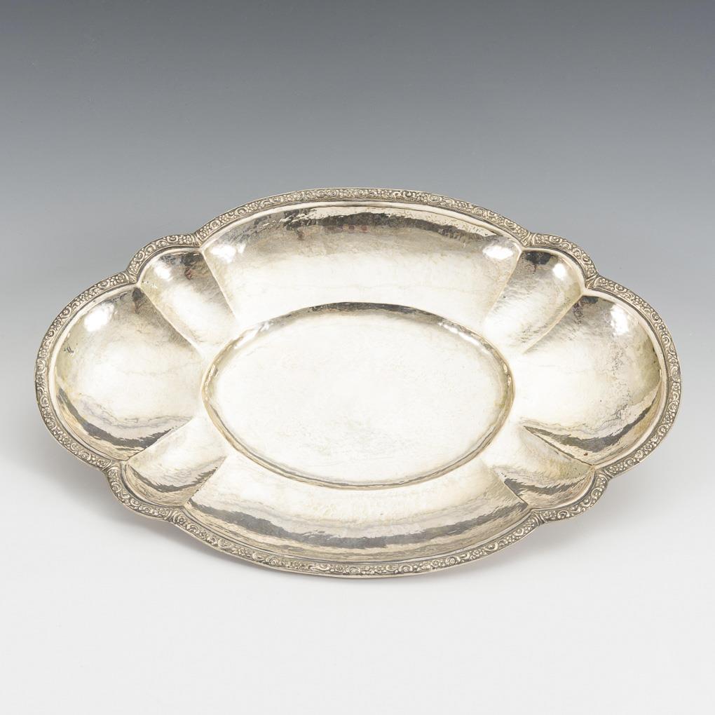 Passig-ovale Art-déco-Schale mit floral reliefiertem Rand. Gebrauchsspuren.