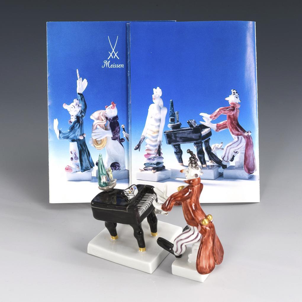 Ausdrucksvoller Klavierspieler und Flügel mit Hund und Getränketablett.