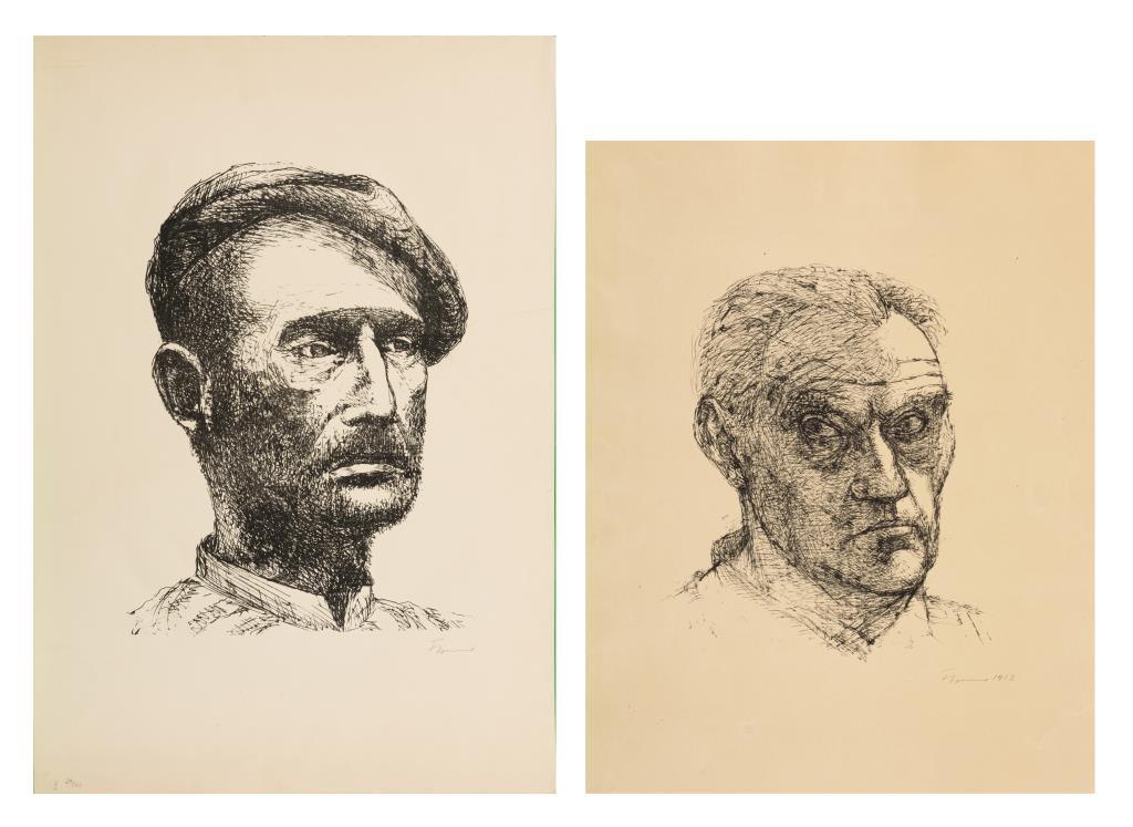 2 Herren-Porträts, 1x verso betitelt "Buchenwaldkopf". Etwas geknickt.
