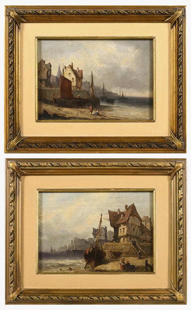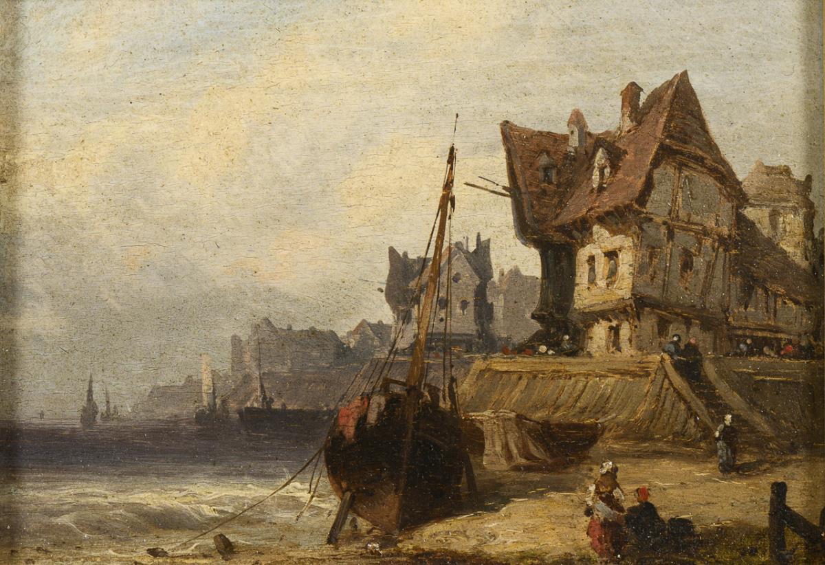 Boote und Staffagefiguren am Ufer mit Blick entlang der Häuser am Meer. Etwas verschmutzt, 1x geringe Retuschen am Rand.