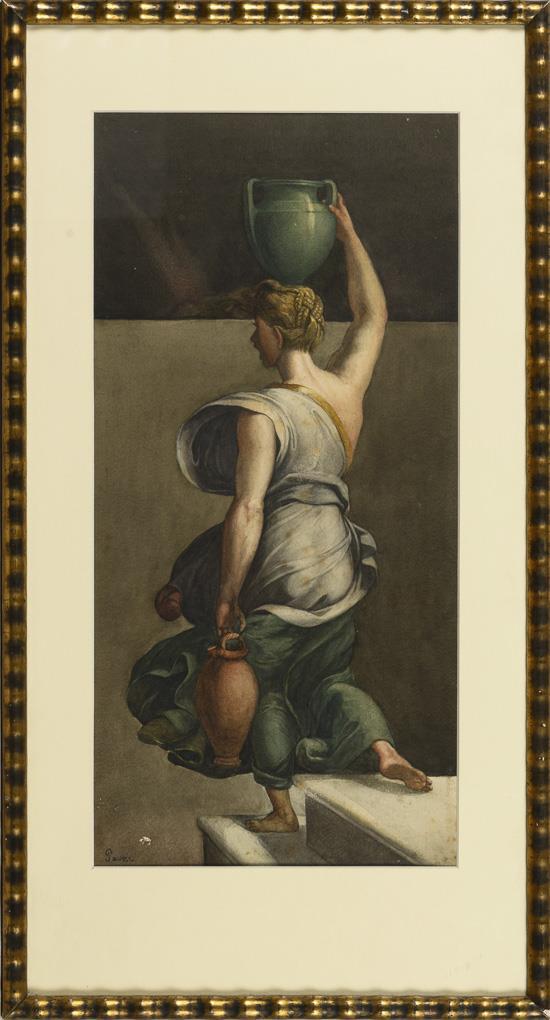 Junge Frau beim Herabsteigen einer Treppe mit Amphora auf dem Kopf und in der Hand. Leicht stockfleckig.