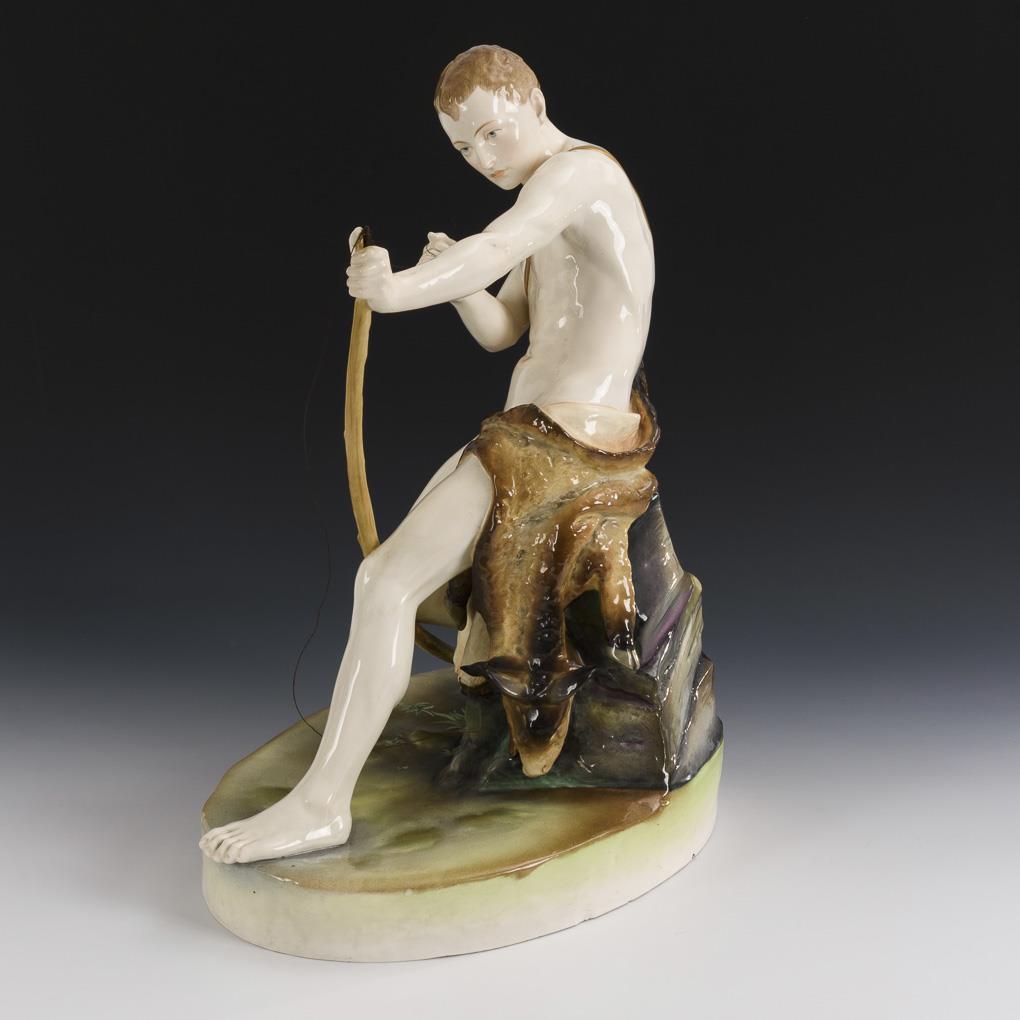 Plastischer Männer-Akt mit einem Ziegenfell, beim Spannen eines Bogens, auf einem Felsen sitzend, ovaler Sockel. Bogenspannung defekt, am Sockel ein Riss.